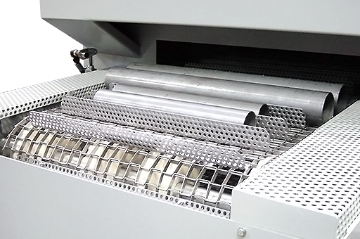 El transporte de las piezas se realiza mediante cinta transportadora con velocidad regulable. La carga se realiza por la parte frontal y la descarga por la parte posterior y puede ser de forma manual o automática.